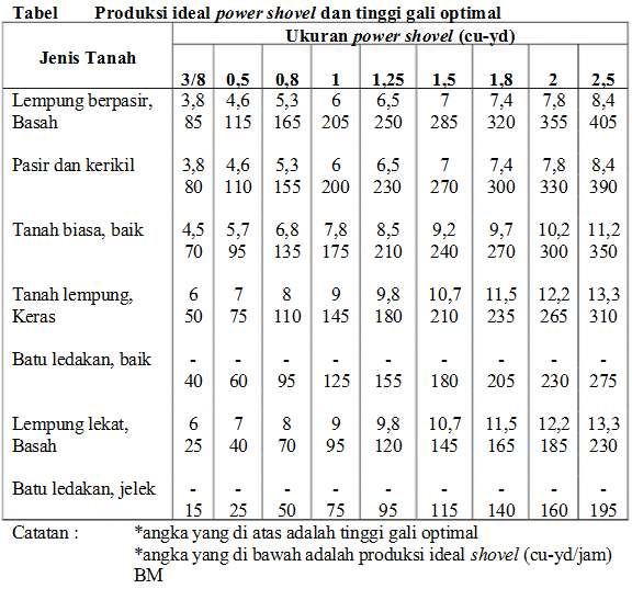 Angka-angka dalam tabel di atas tersebut adalah angka praktik, meskipuntidak tepat benar dapat digunakan sebagai titik tolak perencanaan pekerjaan penggalian tebing. Bila tinggi tebing kurang optimal, maka tidak mungkinmengisi bucket sekaligus penuh dalam satu pass tanpa memberikan beban lebih pada mesin. Hal ini akan menyebabkan lekas rusaknya mesin, maka operator dapat memilih dua kemungkinan, ialah mengisi bucket penuh dalam beberapa kali pass atau membiarkan bucket tidak terisi penuh langsung di dump, tentu sajakedua hal tersebut akan mempengaruhi produksi shovel . Sebaliknya bila tebinglebih tinggi dari optimal, operator harus hati-hati agar tidak terjadi lubang-lubang dalam tebing, yang dapat mengakibatkan longsornya tebing tersebut dan menimpa shovel . Operator dapat memilih menggali dengan mengurangi tenaga tekan pada bucket ke dalam tebing, atau penggalian tidak dimulai di dasar tebing, ataumenggali secara normal tetapi membiarkan tanah tumpah dari bucket dan mengambil cycle berikutnya. Ketiga hal tersebut akan mengurangi produksi shovel .